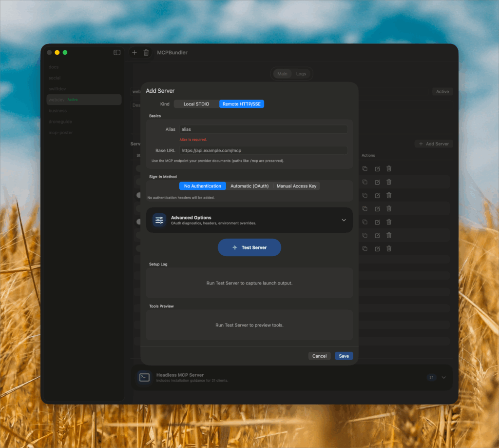 Manage all your MCP servers — both Local STDIO and Remote HTTP/SSE — from one clear macOS window. Start, stop, or edit them instantly without touching configs.