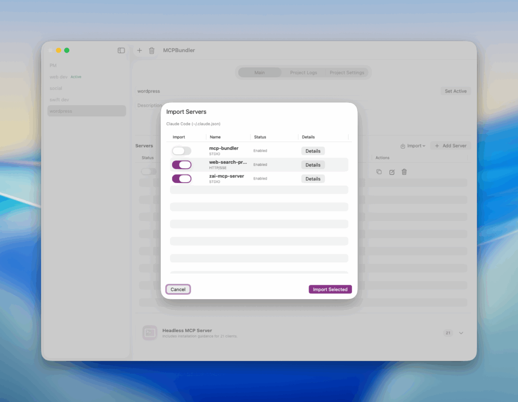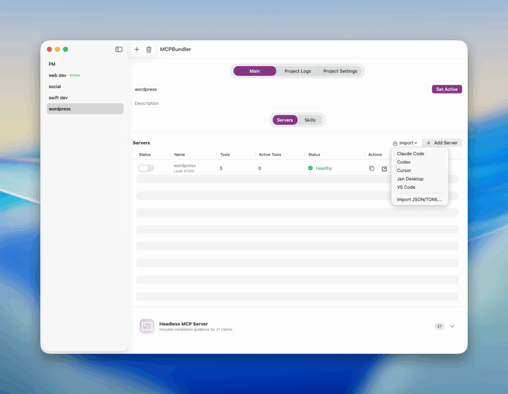 Add servers from Claude, Cursor, VS Code, Jan, Codex, and more with a single click. The new Import button in Project Details automatically detects readable config files, previews every server in a sortable list, and lets you check the ones you want—all with inline error callouts so nothing sneaks past you.